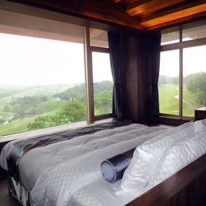 此外,套房最大賣點莫過於窗邊設計,房號260的「青山居」,位於最右邊(即最靠近練習果嶺),打開房門映入眼簾的就是寬敞的客廳,配置舒適的沙發,讓房客和友人可以在此談天說地;一大床KING SIZE設置於架高的木頭地板上,讓房客躺在床上就可以欣賞窗外青山球道與綠水球道的美景,三不五時就可以看到球友擊球,十分愜意。