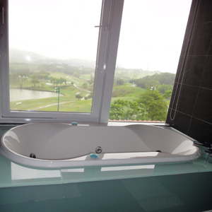 房號259的「綠水房」,位於中間,打開房門就是寬敞的客廳,一樣配置舒適的沙發,此房型為兩大標準雙人床房型,方便球友住宿。「綠水房」的最大特色,就是將按摩浴缸配置於窗邊,讓房客可以邊泡澡邊欣賞窗外球友推桿,泡在「水」中看「綠水球道」,再喝杯「綠茶」,人生享受莫過於此。
