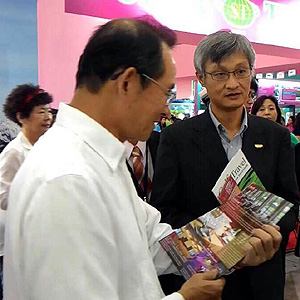 【圖說:駐新加坡台北代表處謝發達認真地在看全國球場的介紹文宣,聆聽全國球場海外代表的介紹】
