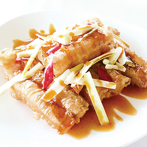 XO醬百花油條:主廚自製新鮮蝦泥加入口感爽脆馬蹄,油炸後以XO醬拌炒,酸甜微辣的豐富口感,絕對滿足您挑剔的嘴。