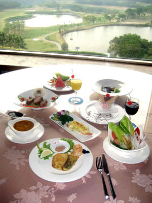 到高爾夫球場,擊球後想必飢腸轆轆,在球場用餐,如果不想再吃中式合菜,不妨嚐試西式套餐,享受一下難得的悠閒時光。永安高爾夫鄉村渡假俱樂部就推出「幸福100套餐」,十道精緻料理,有龍雪魚、焗烤草蝦、西式香雞排等,一套原價一千兩百元,現在特價六百九十元,提供球友中式菜餚之外的另一種西式選擇!