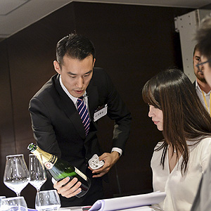 高難度的現場服務考試內容除了考驗侍酒師日常服務的熟練度及專業度外,對於他們在法國葡萄酒的專業知識也做了全方位的測試。考試關卡包括須在二十分鐘內完成六位評審的氣泡酒的侍酒服務、陳年紅酒的醒酒,期間還要對於客人不同喜好和提問正確回答並要有臨場建議顧客餐酒搭配的功力。