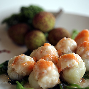 「荔枝」古時候又稱「離枝」,因為它只要一離開樹枝,則保鮮不易。白居易的〈荔枝圖序〉提到︰「若離本枝,一日而色變,二日而香變,三日而味變,四、五日外,色香味盡去矣。」荔枝得新鮮食用,入菜則有不同風味。全國花園鄉村俱樂部四季廳的【百花玉荷包】,以玉荷包鑲入百花餡,鮮嫩多汁、渾圓飽滿的玉荷包,加上口感極佳的百花(蝦漿),一口食用,百般滋味湧現。